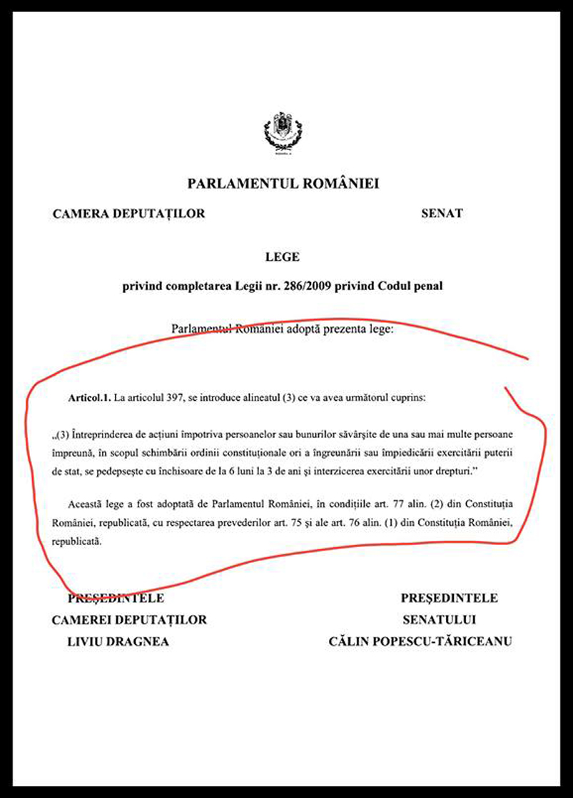 INSIDER: „Parlamentul nostru lucrează. Vă reamintesc că purtătorul de cuvânt al PSD povestea cum protestatarii au împiedicat activitatea guvernului. Deci mare atenţie. A protesta ar putea deveni curând faptă penală.” (…) „Momentan e doar la senat. Trebuie să fim cu ochii pe ce se întâmplă.” (…) „Sună a Codul penal din 1968.” (…) „Dacă ieşi la protest, poţi să faci închisoare. Dacă furi din banul public sau faci abuz în serviciu, nu mai faci închisoare (cel puţin aşa vor ei să modifice).” (…) „Să se apuce să facă şi 300.000 de locuri în închisori!” (SURSA) DETALII