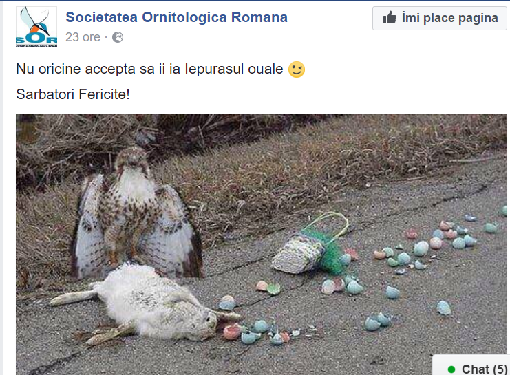 INSIDER: „Din ciclul „nu sunt deştept, dar când mă uit în jur prind curaj”. Ăsta este felul în care cei de la Societatea Ornitologică înţeleg să promoveze „iubirea” pentru păsări (prădatoare sau nu). Ne transmite „Paşte fericit” lângă un iepuraş mort, ucis de prădător. Ignoranţă sau sadism? Care este diferenta dintre poza asta şi cea a unui vânător care a împuşcat un iepuraş?” (SURSA)