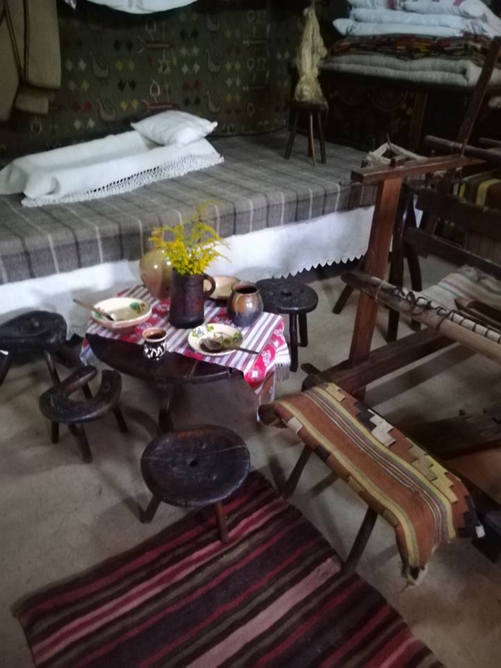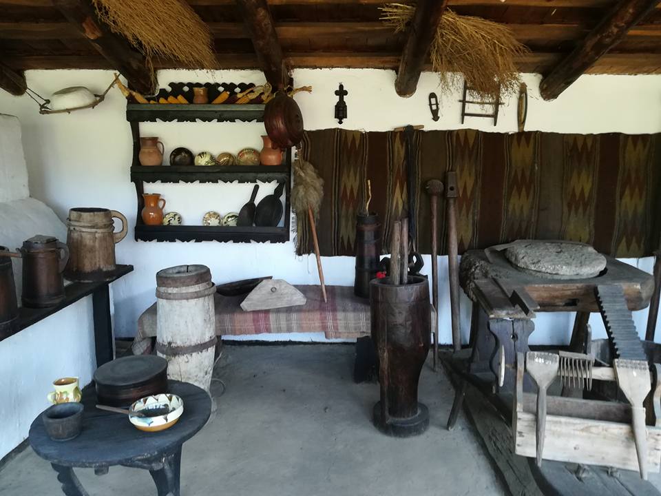 Căsuţa din bârne de lemn şi acoperită cu draniţă cuprinde trei încăperi: tinda, camera de locuit şi cămara, toate lipite cu lut pe jos, cu geamuri şi uşi mici. Camera principală este organizată după specificul interiorului casei ţărăneşti din acea vreme: sobă mare cu cuptor de dormit, culme pe care atârnă hainele de sărbătoare, ladă şi masă de zestre, laviţă pentru şezători, icoane vechi, ştergare la ferestre, iar în mijloc, uneltele de ţesut şi tors pe care orice gospodină trebuia să le aibă în casă. Peste tot răzbate simplitatea, iar mirosul de sânziene atârnate la grindă sporeşte parcă emoţia întâlnirii cu tradiţia românească, de mult uitată şi acaparată de modernism. (SURSA) (DETALII) (SURSA FOTO)