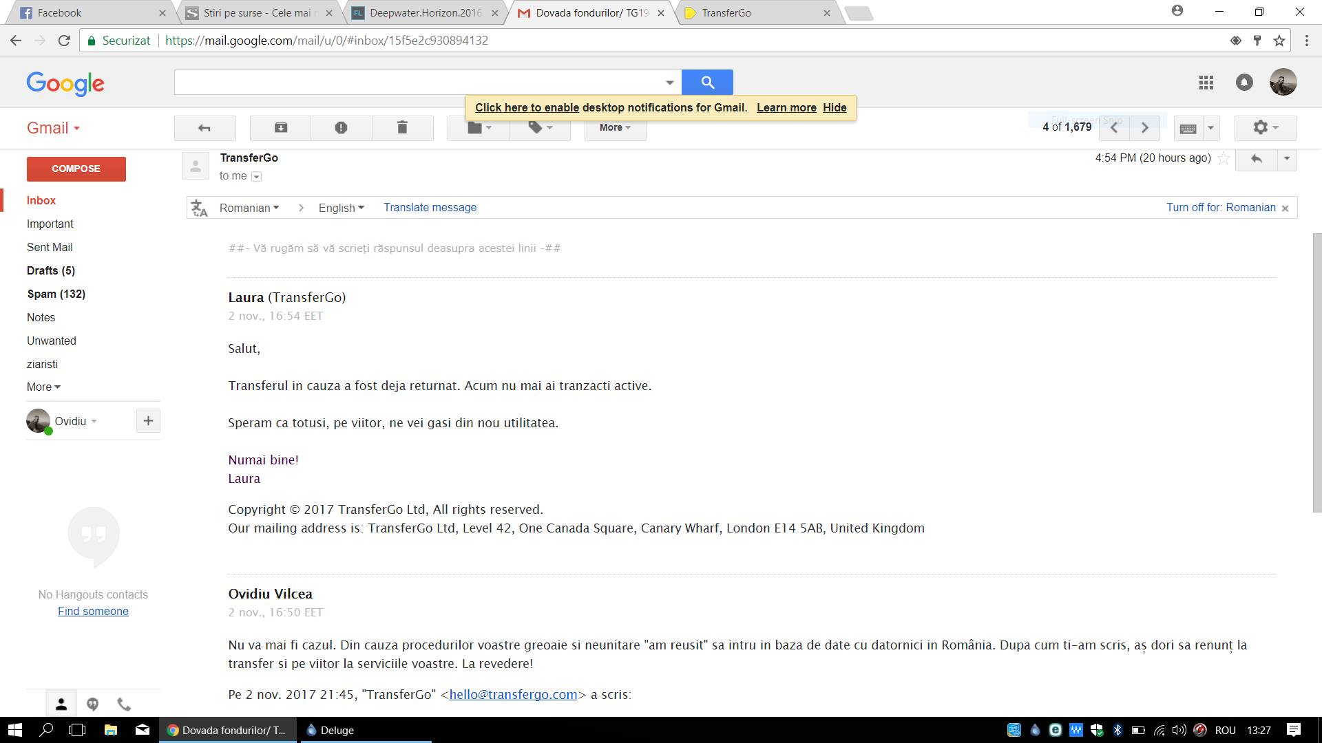 INSIDER: „Care vă gândiți să faceți plăți cu TransferGo, mai gândiți-vă! Cred cu tărie ca angajații lor – unii dintre – habar n-au ce mailuri învârt pe acolo… Sunt plecat în afara E.U. și pot spune că echipa fericirii a reușit să-mi strice vacanța și să mă bage în baza de date a Biroului Unic de Creditare al vieții… Știe careva adresa la un OPC al UE? Mi se pare inadmisibil ce au făcut băieții aștia.” (SURSA)