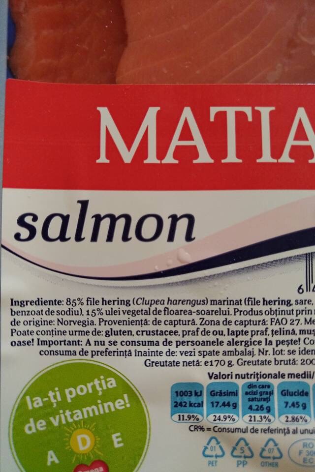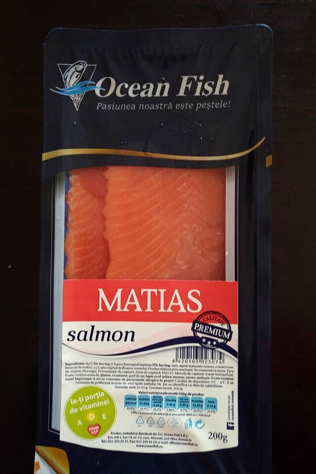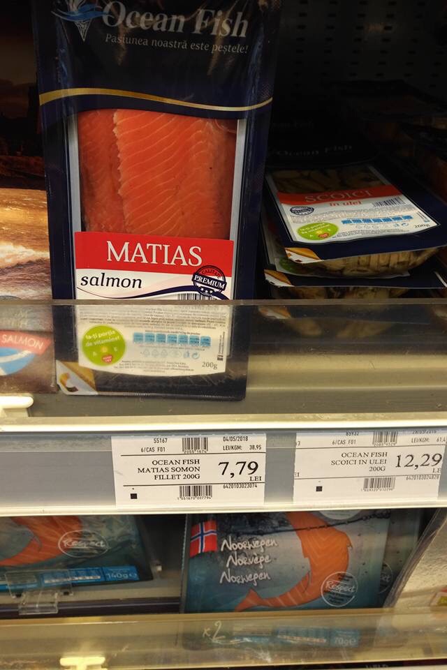 INSIDER: „Am fost la Mega Image ca să cumpăr niște somon pentru o rețetă de risotto. Am luat pachetul din imagine fix de la raftul de somon, având eticheta de somon. Acasă am constat ca somonul meu era de fapt 85% hering. Am intrat pe net și am găsit produsul ca fiind hering botezat de producător „salmon matias” . Nu doar că heringul e botezat somon dar e și vopsit în roșu ca somonul. Heringul fiind un pește cu carne albă. În concluzie, înșelăciune în forma continuată: producătorul induce consumatorul în eroare punând produsului două elemente care nu-i aparțin, nume și culoare. Apoi magazinul îl așează la raionul de somon cu eticheta de somon. Băi nene, pe ăștia chiar nu-i mai oprește nimeni?! Sau e nevoie să le dăm anumite organe personale pe care sa le botezam acadea, prăjitură, bomboana etc …?