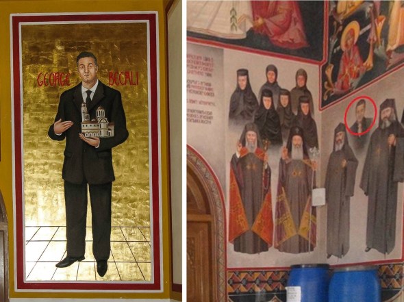 Povestea are şi o latură mai pământeană: nenumaratele scandaluri privind banii strânşi pentru construirea bisericii, ce au disparut fără urmă. Azi biserica e aproape gata având ca ctitor un cunoscut patron de echipă de fotbal obscură. Prima versiune a picturii era cu Becali singur pe perete. Din motive evidente, pictura a fost ștearsă si acum în pictură apar toți cei ce au contribuit la ridicarea bisericii.” SURSA