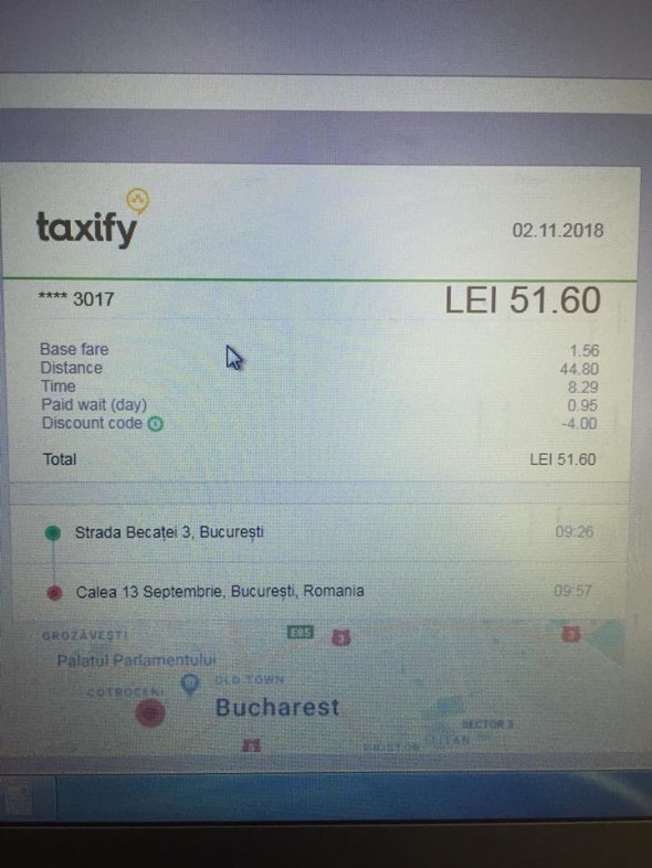 INSIDER: „Mare atenție celor care folosesc aplicația Taxify. Astăzi am efectuat o cursă din Str. Becaței în Calea 13 Septembrie (10 km) și am avut șocul de a constata că am fost taxată pentru o cursă de 44 km (51 RON). Când am acceptat comanda era pentru aproximativ 20 RON. După ce am primit dovada plății și după ce mi-am revenit din șoc, am sunat șoferul, care s-a spălat pe mâini zicând că el e doar șoer, nu are cu ce să mă ajute. Am contactat Relații Clienți (suport din aplicație), evident niciun răspuns… pe principiul românesc: s-a rezolvat, nu se poate! SHARE MASIV, PLEASE! Trebuie măcar să recunosc că șoferul de la Taxify a realizat o minune, a parcurs 44 km, în 30 de minute, în traficul de dimineața în București. P.S. Eu am dezinstalat aplicația și am făcut reclamație la OPC. În cazul în care mai sunt pagubiți ca mine, vă rog, luați atitudine. Nepăsarea lor este paguba noastră. ÎNDRĂZNEȘTE SĂ FOLOSEȘTI TAXIFY!!!” SURSA