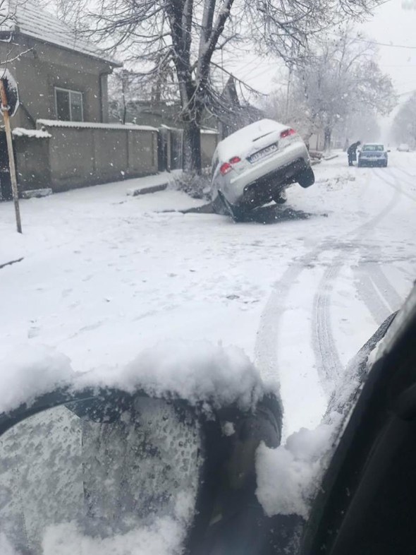 INSIDER: „Gropile și șanțurile de la Calafat au început să înghită mașini! Mașina a derapat din cauza zăpezii. Fotografie făcută azi 16.12.2018 pe strada 1 Mai.” SURSA