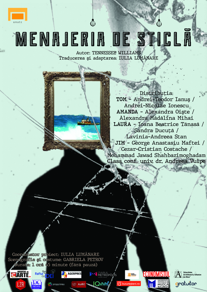 „Menajeria de sticlă” este o comedie amară, subtilă, în care nostalgia se confundă cu furia, iubirea cu sufocarea și vinovăția cu tandrețea. Piesa este amintire. Este rememorarea unui trecut cu care Tom Wingfield – alter ego-ul lui Tenesee Williams – încearcă să facă pace. Este rememorarea procesului dureros al unui dublu abandon: desprinderea lui Tom de iubirea acaparatoare a mamei și de sentimentul sufocant de resposabilitate pentru Laura, sora lui infirmă. Distribuția: TOM – Andrei-Teodor Ianuș. AMANDA – Alexandra Oiște. LAURA – Ioana Beatrice Tănasă. JIM – George Anastasiu Maftei.