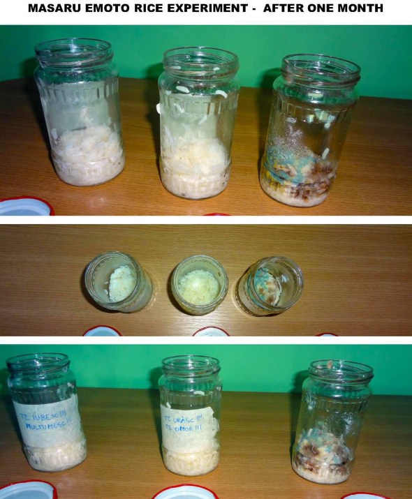 INSIDER: „Acum exact o lună, am decis să reproduc experimentul dr. Masaru Emoto legat de conștiința și memoria apei. Fiind foarte reticent din fire, am decis să verific personal și ăsta este rezultatul după o lună. Orezul din borcanul pe care am aplicat eticheta cu cuvintele „te iubesc și mulțumesc” a rămas neschimbat ca textură și culoare (doar un plăcut miros de ușoară fermentație), orezul din borcanul unde am scris „te urăsc, te omor” s-a îngălbenit puțin dar mirosul este puternic de brânză stricată, iar ultimul borcan unde am pus orez dar pe care l-am ignorat efectiv o lună…a mucegăit și a putrezit. Menționez că orezul a fost același în toate borcanele și pus în aceeași zi, în aceleași condiții și în aceeași cameraă. Zilnic am citit cu voce tare ce era scris pe borcan și am încercat să transmit mesajul, intenția și emoția către borcanul cu eticheta respectivă ca și cum aș fi vorbit cu o persoană. Rezultatul a fost surprinzător până și pentru mine: a confirmat pe deplin ceea ce afirma dr. Emoto și anume…conștiința umană, puterea cuvintelor și a gândurilor pot influența structura apei la nivel fizic dar mai ales la nivel cuantic.