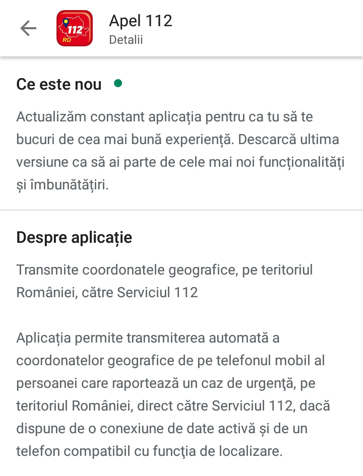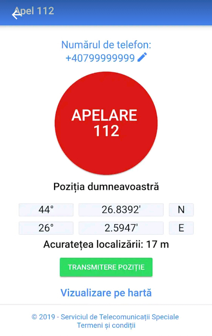 STS: „Aplicația permite transmiterea automată a coordonatelor geografice de pe telefonul mobil al persoanei care raportează un caz de urgenţă, pe teritoriul României, direct către Serviciul 112, dacă dispune de o conexiune de date activă şi de un telefon compatibil cu funcţia de localizare. (…) La apelarea numarului 112 prin intermediul aplicatiei, coordonatele se transmit automat catre sistemul 112. Acel buton se apasa doar in situatia in care, dupa un apel la 112, este necesara retransmiterea coordonatelor.” DETALII