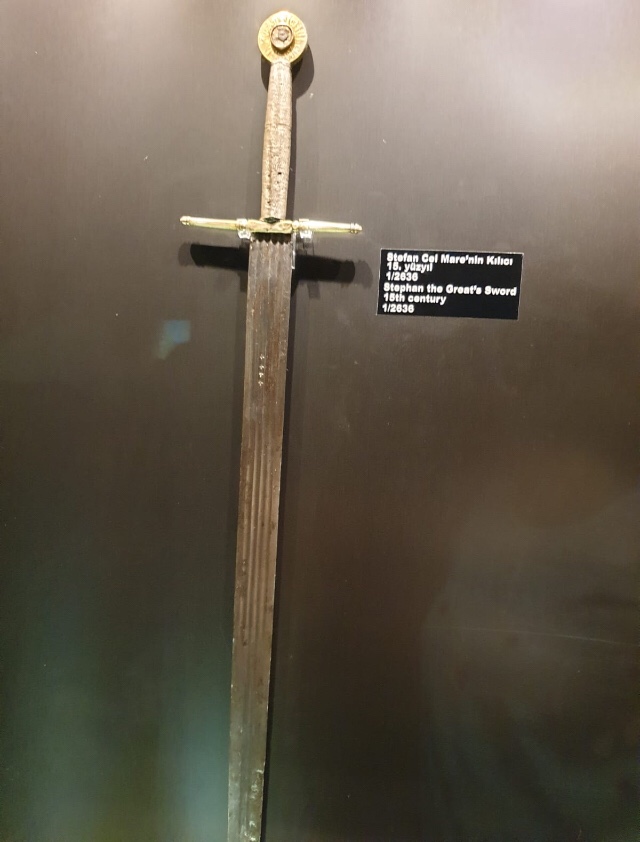 INSIDER: „Unul dintre cele mai importante artefacte din muzeul Topkapî (fostul mare palat al sultanilor otomani) din Istanbul, Turcia, este o armă, spada voievodului Ştefan cel Mare, încărcată de legendă, venerată şi temută de turci, construită dintr-un oţel special la indicaţiile personale ale voievodului. Atrage atenţie prin dimensiuni, dar mai ales prin heraldica mânerului: pe discul acestuia apar stema Moldovei, capul de bour şi inscripţia în slavonă ”Io Ştefan Voievod domn al Ţării Moldovei”. Arma are două tăișuri și se folosește cu ambele mâini pentru că necesită o forță fizică extraordinară, spre deosebire de sabia cu un tăiș care se utilizează cu o singură mâna. Spada lui Ștefan cel Mare era tipic moldovenească, aceasta individualizându-se în Epoca Medievală.