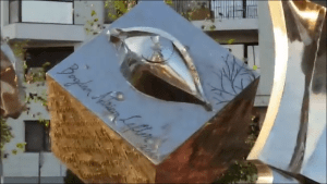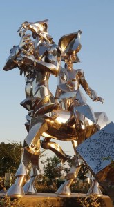 INSIDER: „A mai picat un mit, un angajator chiar a ridicat o statuie angajatului său. Știți vorba aia : „Ce muncești mă așa, crezi că o să-ți facă statuie?” Acest „călăreț” ne trimite cu gândul către varianta modernă a lui Don Quijote sau a Sfântului Gheorghe. Se poate observa cum țintește cu sulița ochiul plasat pe una din fețele cubului de la baza ansamblului statuar. Pe celelalte fețe ale cubului sunt diferite mesaje pe care le puteți citi în fotografiile alăturate.
