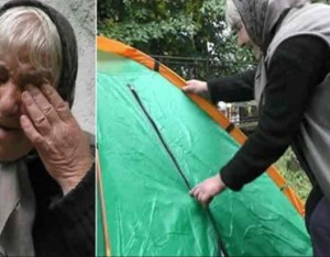 SOLUȚIA DE „URGENȚĂ”: În disperare de cauză, doamna Călugăr a împrumutat un cort în care să locuiască în curtea imobilului – după ce a informat proprietarul acesteia (biserica evanghelica). Nota: doar casa a fost vândută, terenul rămânând în continuare a Bisericii Evanghelice.