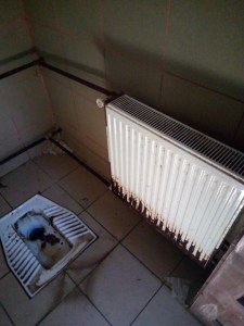 Interesantă nu este mizeria lăsată de cel ce a folosit-o ultimul, ci toaleta în ansamblul ei, ușa, pereții, caloriferul, dispunerea conductelor, etc