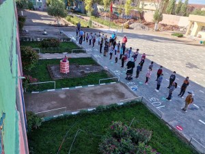 Atmosferă_sumbră, mai degrabă de cazarmă ori închisoare decât de deschiderea unui nou an școlar. Aliniați militărește spre a intra în clasă. Observați bucuria și veselia de pe chipurile acestor prichindei aflați în prima zi de școală din viața lor. Nu sunt la ora de educație fizică ci într-o pauză dintre ore, într-o aliniere cazonă, fiecare în ”pătrățelul ” lui, corect distanțați social. Nu au voie să se joace și nici să interacționeze în vreun fel. Au în schimb voie să respire fără mască. Atunci când cadrele didactice sunt transformate în cadre sanitare …