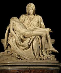 INSIDER: „Pietà este o sculptură creată în anii 1498-1499 de artistul Michelangelo Buonarroti. Acum capodopera, o valoare inestimabilă a sculpturii renascentiste se află la Vatican, în Bazilica Sfântul Petru. Este singura lucrare semnată de Michelangelo. Semnătura poate fi văzută pe centura care îi încinge pe diagonală pieptul Fecioarei. Statuia a fost realizată pentru cardinalul francez Jean de Billheres, care fusese repartizat în Roma. Statuia a fost făcută ca monument funerar al cardinalului, dar a fost mutată în prima capelă pe partea dreaptă de la intrarea în bazilică, în secolul XVIII, unde se găsește actualmente.