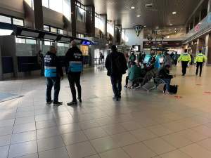 Ceea ce vedeți în imagini se întâmplă, din ce înțeleg, destul de frecvent. Este un conflict între două companii care oferă servicii de testare Covid pasagerilor.
