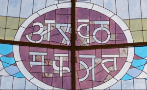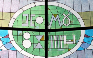 Vitraliul are 12 ovale, cu 12 compoziţii care ilustrează principalele tipuri de scriere cunoscute (tărtăria, cuneiform, fenician, hieroglific, persan, chirilic, demotic, etc.), iar cele două corpuri de iluminat se compun sub forma globului pämäntesc cu mediane şi paralele, cam aşa arată partea inferioară. Partea superioară a globului simbolizează motivul solar. Primele manifestări ale Creaţiei Divine: aerul, focul, pământul şi apa stau la baza lucrării.” Text/foto: Centrul de Informare și Promovare Turistică Vâlcea” SURSA