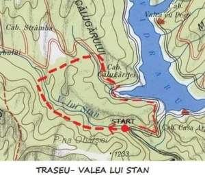 La nici 5 minute de la intrarea pe firul văii se ajunge la o amenajare hidrologică, un mic baraj ce-l veţi depăşi cu ajutorul unei scări metalice, montate în stânga acestuia. Continuaţi pe firul văii, valea fiind seacă la început, apoi un firav fir de apă îşi face apariţia. În timp scurt, circa 30 minute de la plecare, apar primele amenajări. Sunt scări metalice cu balustradă, verticale sau prinse în coasta muntelui, suspendate deasupra celor şase cascade de diverse dimensiuni. Traseul ocoleşte prin stânga o scurtă îngustare de circa 150 m, un fel de canion în canion. Această porţiune poate fi străbătută şi prin apă la debit scăzut. În continuare traseul însoţeşte o înşiruire de cascade, unele şi de 30 m, despărţite de marmite de mari dimensiuni. Cea mai spectaculoasă porţiune o constituie traversarea pe pasarela metalică suspendată peste firul îngust al văii, pe deasupra pragului dintre două cascade. Odată traversat acest podeţ, aveţi şi de urcat o scară verticală, lungă de circa 10 m. Pentru cine nu a mai străbătut trasee cu poteci suspendate deasupra hăurilor, aceasta va fi o porţiune plină de adrenalină. Traseul nu te lasă să te relaxezi nici o clipă, căci urmează alte cascade de escaladat, mici lacuri sau bolovani uriaşi de ocolit. Nici nu-ţi dai seama cum trece timpul între pereţii înalţi ce te împresoară. Căţăratul te ţine concentrat să nu aluneci. Canionul Valea lui Stan Făgăraș Cascada, Canionul Valea lui Stan Făgăraș Scoabe. Veţi şti că aţi ajuns la finalul traseului atunci când veţi trece peste stăvilarul ce barează mare parte din apa văii. Apa este deviată spre barajul Vidraru, tot acolo ducând şi marcajul turistic.