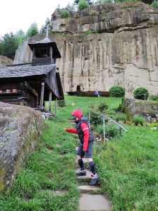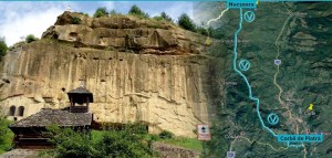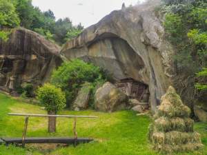 * La punctul de start, avem un muzeu de familie – Căsuța albastră, unde se expune o gospodărie tipică acestei zone a țării. Ce este mai interesant descoperim în spatele ogrăzii, chiar încrustat in jgheabul de piatră: ceea ce par a fi urmele unui uriaș. De asemenea, conform legendelor locale, prima cristelniță săpată în piatră, utilizată la primele ceremonii de botez de pe aceste meleaguri;