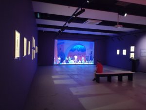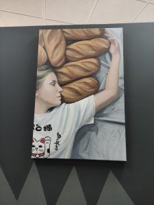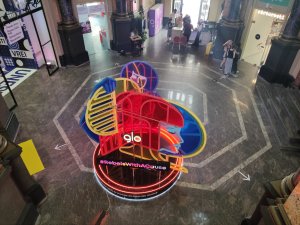 În holul central, la intrare, loc ocupat alte dăți de vreo sculptură monumentală zace o reclamă Glo pentru fumătorii fără brichetă. Prin contrast, în încăperea „de artă Glo”, vizitabilă doar de cei peste 18 ani și în care fix cei mici țâșnesc înaintea părinților (fiind totdeauna cu mult mai colorată decât restul!) părinții+ minorii sunt instant „sancționați” de o domnișoarā vigilentă. Niciodată nu am știut ce ar putea face un copil cât timp părintele ar vizita o astfel de încăpere/ încăperi (prezente în mai toate expozițiile temporare contemporane) așa încât dacă reușesc să o detectez în timp util „o sărim” cu eleganță.