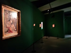 Sălile din Pavilionul Theodor Aman decorate în verde smarald au ca singură sursa de lumină câteva leduri slabe care dau un plus de strălucire tablourilor.