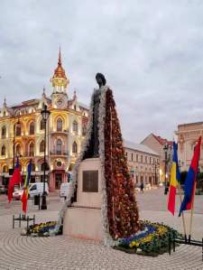 O zi întreagă au muncit trei florari din Beiuș, ca să învăluie statuia Reginei Maria din Oradea și soclul din fața teatrului, care-i poartă numele.