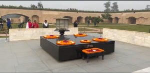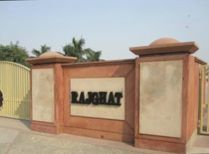 N.R.: „Raj Ghat este un memorial dedicat lui Mahatma Gandhi din Delhi, India. Inițial a fost numele unui ghat istoric din Old Delhi (Shahjahanabad). Aproape de ea și la est de Daryaganj se afla Poarta Raj Ghat a oraşului cu ziduri, care se deschidea la Raj Ghat pe malul de vest al râului Yamuna. Mai târziu, zona memorială a fost numită şi Raj Ghat. Este o platformă de marmură neagră care marchează locul incinerării lui Mahatma Gandhi, Antyeshti (ultimele rituri) la 31 ianuarie 1948, la o zi după aceea.asasinat. Este lăsat deschis spre cer în timp ce o flacără eternă arde la un capăt. Situat pe şoseaua de centură a Delhi, cunoscută oficial drept Mahatma Gandhi Road, o potecă de piatră flancată de peluze duce la incinta cu ziduri care adăposteşte memorialul. Materialele folosite în memorial, în special în adâncituri, ridică câteva întrebări despre natura arhitecturii gandhiene din India.