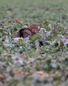 Cum am ajuns primul lângă pădure (nu se vede in cadrul ăsta) am avut vreme să stau lângă mașina și să mă gândesc. În depărtare erau vreo câteva căprioare, prea departe să ajung la ele cu teleobiectivul… Când, deodată, am zărit mai aproape, în lanul de rapiță, o formă familiară: o pisică la vânătoare de șoricei. Doar că mi s-a părut că e prea mare…. sit un pic tărcată cam ca una sălbatică. Am scos repede telefonul, și, cu un ochi in teleobiectiv am ajuns la concluzia că e chiar o pisică sălbatică (poate naturaliștii și biologii să mă contrazică, eu așa cred). Am așteptat apoi să vină Alexandra și Ștefan, după care am început să ne apropiem ușor de ea. Încet-încet am ajuns la distanța de la care am putut să facem și poze. Era cam întuneric, așa că mai bine decât prima fotografie n-am prins. Deși ea, săraca, a stat la poze un minut, din momentul în care ne-a văzut. După care s-a furișat în pădure și ne-a lăsat cu ce vedeți…) Și cu bucuria că mai sunt animale sălbatice atât de aproape de noi…” SURSA