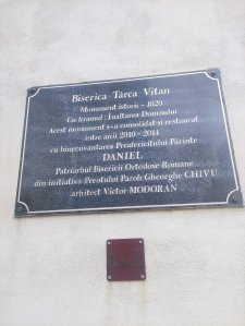 N.R.: „Biserica Târca Vitan, Monument istoric – 1820 cu hramul: İnălțarea Domnului Acest monument s-a consolidat și restaurat intre anii 2010-2014 cu binecuvântarea Preafericitului Părinte DANIEL Patriarhul Bisericii Ortodoxe Române din inițiativa Preotului Paroh Gheorghe CHIVU arhitect Victor MODORAN’