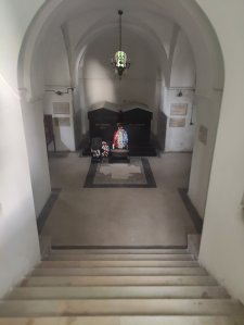 Necropola din subsolul bisericii este prevăzută cu două aripi. Cum cobori scările, întâlnești în partea centrală a încăperii criptele tatălui şi fiului, în spatele acestora, uşor lateral stânga, am citit piatra funerară a criptei fiicei Florica, iar în aripa din dreapta sunt înmormântați alți membri ai familiei. În fața mormintelor principale din necropolǎ străjuieşte astăzi o placă comemorativă cu chipul lui lon Brătianu, realizată în fontă.