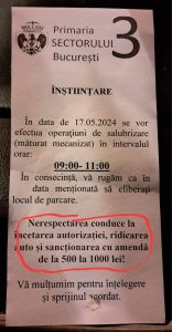 SECTOR 3: În ziua de curățenie toate mașinile parcate legal trebuie să dispară 2 ore. „Nerespectarea conduce la încetarea autorizației, ridicarea auto și amendă de la 500 la 1000 lei!”
