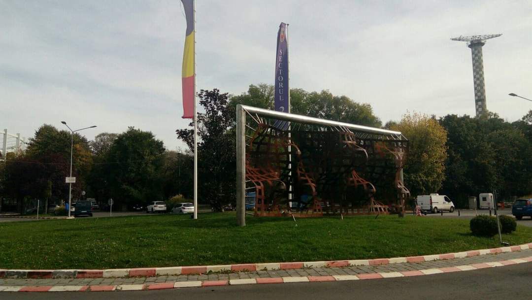 MONUMENTUL GENERAȚIEI DE AUR: Poartă de fotbal supradimensionată, gravată cu numele celor mai buni jucători și antrenori dați de România