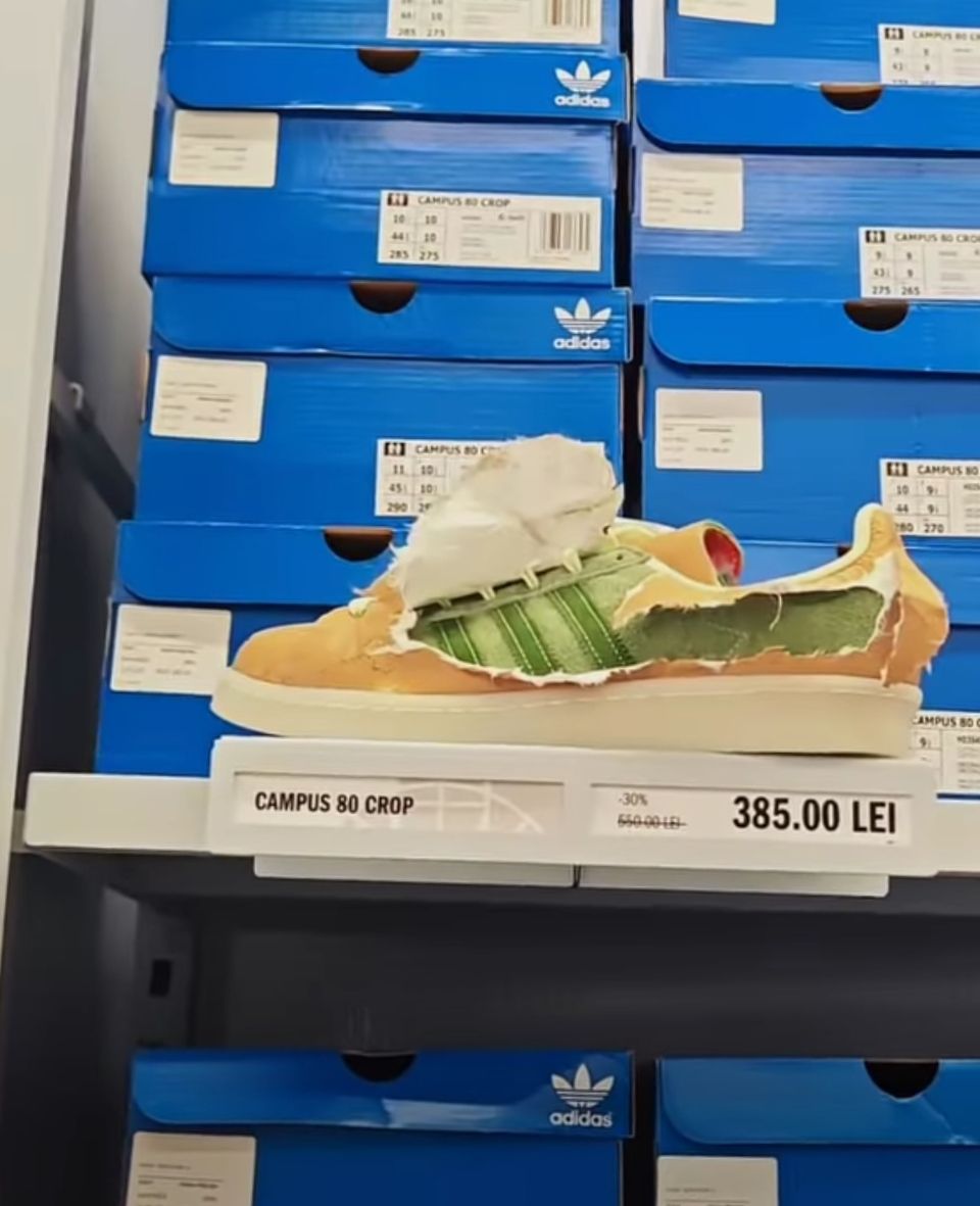 INSIDER: „Adidas Originals Campus 80 Crop 420. În cutie sunt ca noi pe crem, când încep să arate precum hârtia mototolită îi decojesti și ai alți adidași noi din piele întoarsă verzi. Un fel de Kinder cu surprize. Unisex. Preț 385 lei după ce a fost redus 30%.” SURSA