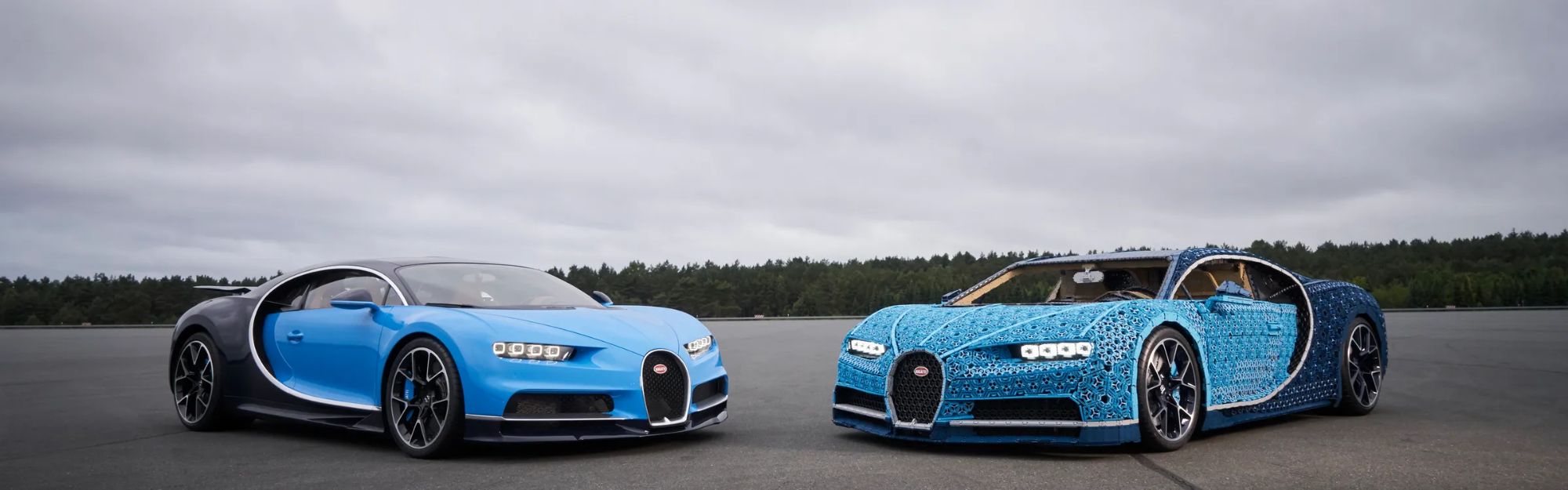 N.R.: Maşina din partea dreaptă e replica 1:1 făcută din LEGO pentru Bugatti Chiron. E o mașină funcţională, care poate merge cu maximum 20 km/h cu ajutorul motoarelor LEGO Power Function. Maşina e construită din 1 milion de piese de LEGO asamblată fără a folosi adezivi și poate găzdui doi pasageri. Mai mult, a fost și în România în anul 2019 în showroom-ul eMag din Băneasa Shopping City.