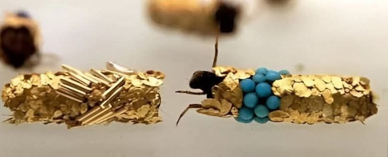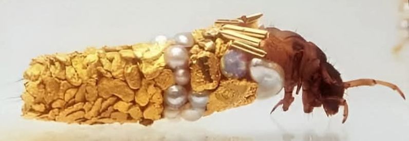INSIDER: „Larvele Trichoptera au o abilitate unică: de a construi huse de protecție cu materiale din împrejurimile lor. Artistul francez Hubert Duprat (n.1957, Franța), din anii 1980, a profitat de acest comportament oferind aur, perle și pietre prețioase. Larvele, urmându-și instinctul, creează mici bijuterii vii cu aceste materiale, îmbinând arta și natura. Acest proiect combină biologia și creativitatea, evidențiind adaptabilitatea insectelor și provocând limitele dintre natural și artistic. Piesele au captat atenția artiștilor și oamenilor de știință pentru inovația și frumusețea lor. ” SURSA