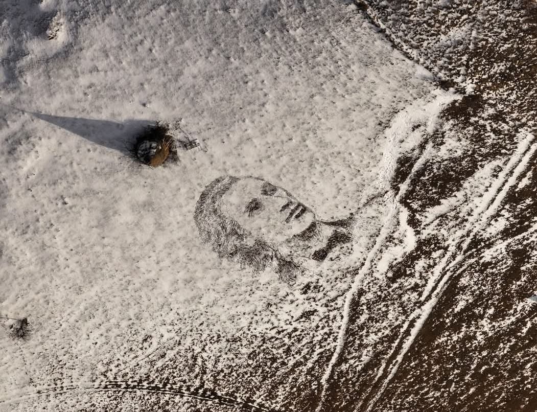INSIDER: „Chipul lui Mihai Eminescu a fost desenat cu piciorul prin zăpadă de artistul Paul Şerban din Valea Jiului. Lucrarea lui, vizibilă doar de la înălțime, este efemeră pentru că depinde de condițiile meteo.” SURSA