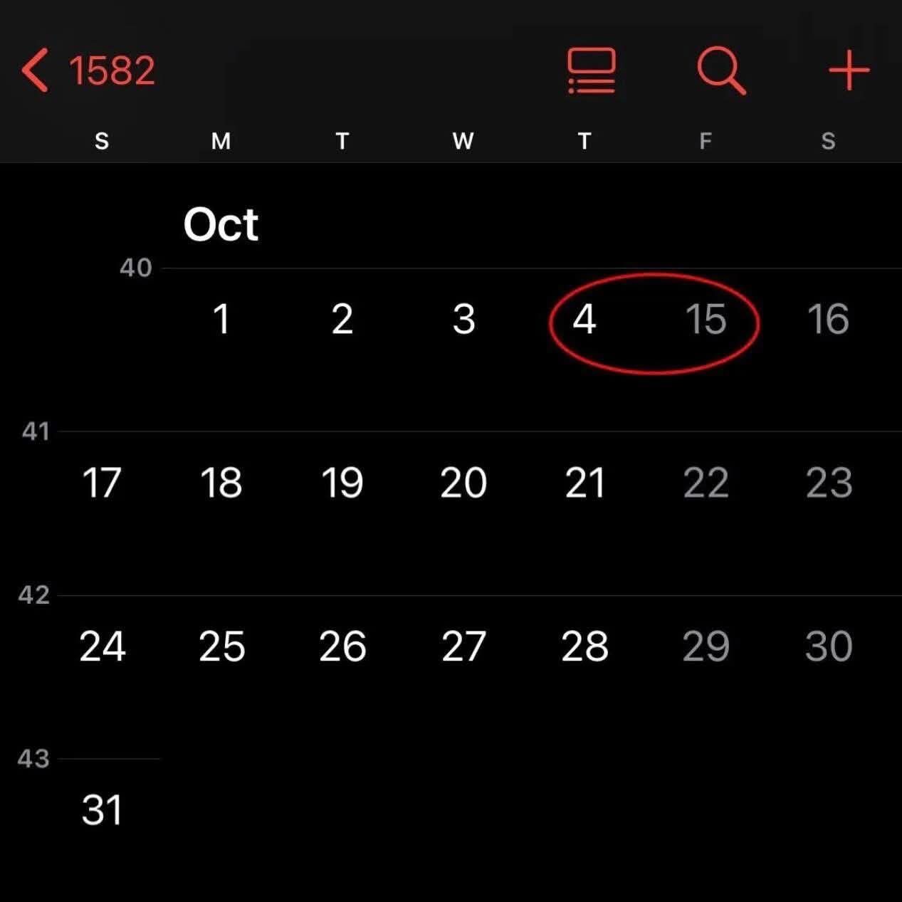 N.R.: „Imaginea prezintă o captură de ecran a unui calendar digital, afişând luna octombrie a anului 1582. Se observă o particularitate în numerotarea zilelor, unde după data de 4 octombrie urmează direct data de 15 octombrie, evidențiată printr-un cerc roșu. Această aranjare neobișnuită reflectă tranziția de la Calendarul lulian la Calendarul Gregorian în anul 1582, o reformă iniţiată de Papa Grigore al XIII-lea. Cele 10 zile lipsă (de la 5 la 14 octombrie) au fost eliminate pentru a corecta acumularea de erori în calendarul lulian, care nu reflecta cu exactitate durata anului solar.”