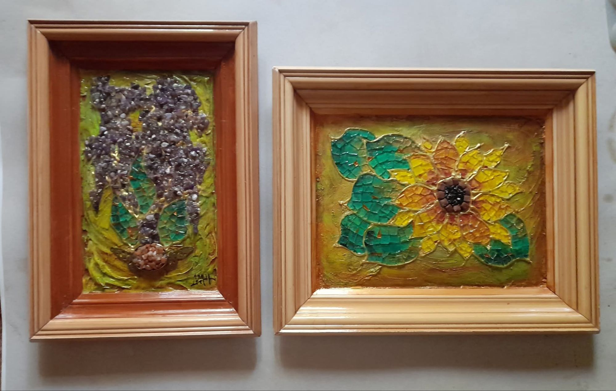 „MOZAJ” & ANA-MARIA HOMEAG: „Liliac” (30×49) ametist și jad; ,,Floare de Soare” (45×35) mozaic de sticlă, îngrozitor de disponibile, că am scadență la facturi ….”‘