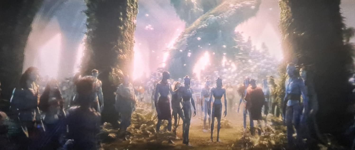 Revenind la film, nu apar ființe noi – sau dacă apar, prea puține – sunt din gama vietăților agresive de pe Pandora. Apar în schimb navi ăia răi, nu mai e bătaia între navi și oameni, e bătaia între navi ăia buni pe de o parte și navi răi + oameni pe de cealaltă parte. Șefa aia de trib navi rea eclipsează privirea, e frumoasă – și ca gesturi, și ca interpretare – merită să mergi să vezi filmul doar ca să o vezi pe ea. Ceilalți – Jakesully, Neytiri, Colonelul – neschimbați de la Avatar 2, mai apar și copiii lor care își joacă rolurile bine. Undeva prin pozele atașate e și o poză cu Eywa – Mama tuturor ființelor, care nu apărea în filmele anterioare.