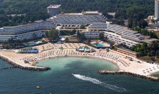 OLIMP, MAREA NEAGRĂ: Complexul hotelier Amfiteatru-Panoramic-Belvedere cu Eminescu, Kogălniceanu, Mihai Viteazul amplasați pe aleea spre plajă & multe steaguri ale României arborate de proprietarul libanez