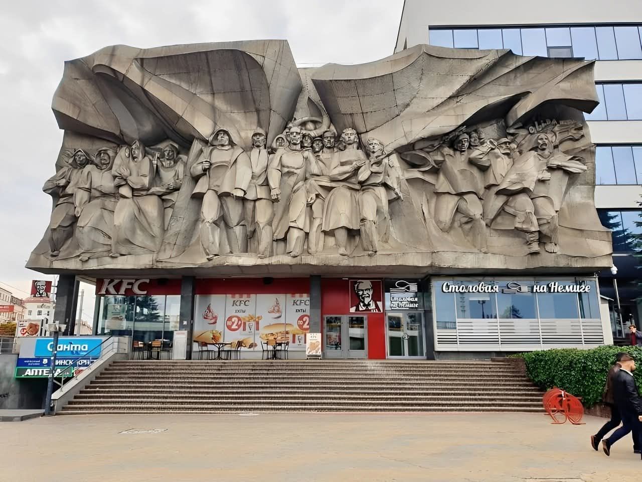 N.R.: „Un restaurant KFC în Minsk, Belarus. Clădirea care îl găzduiește prezintă un basorelief masiv, în stil realist socialist cu un grup de oameni, muncitori, soldaţi şi ţărani, care simbolizează forța și unitatea poporului sovietic. Clădirea se află pe strada Nemiga (Немига) din Minsk..”