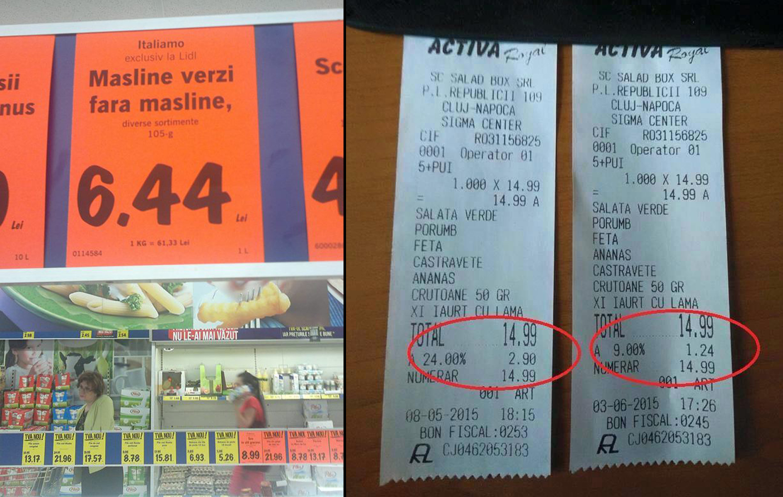 INSIDERI: 1. „Exclusiv la Lidl Vaslui.” (SURSA). 2. „Dacă cineva mai are vreun dubiu că ar fi avut loc o scădere de preţ ca urmare a reducerii TVA, după cum vedem: deşi TVA este, pe primul bon, 24%, iar pe cel de-al doilea este 9%, preţul este acelaşi. Felicitări, domnule prim ministru, pentru viziunea Dvs. economico-fiscală.” (SURSA) 3. „Varză de China produsă în Polonia, adusă de unguri, vândută în hypermarket nemţesc. Oare ce mai trebuie adăugat?” (SURSA)
