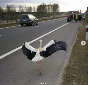 BELARUS: O barză s-a alăturat timp de 4 ore unei procesiuni religioase. A mers pe șosea 12 kilometri, fără frică de mașini!