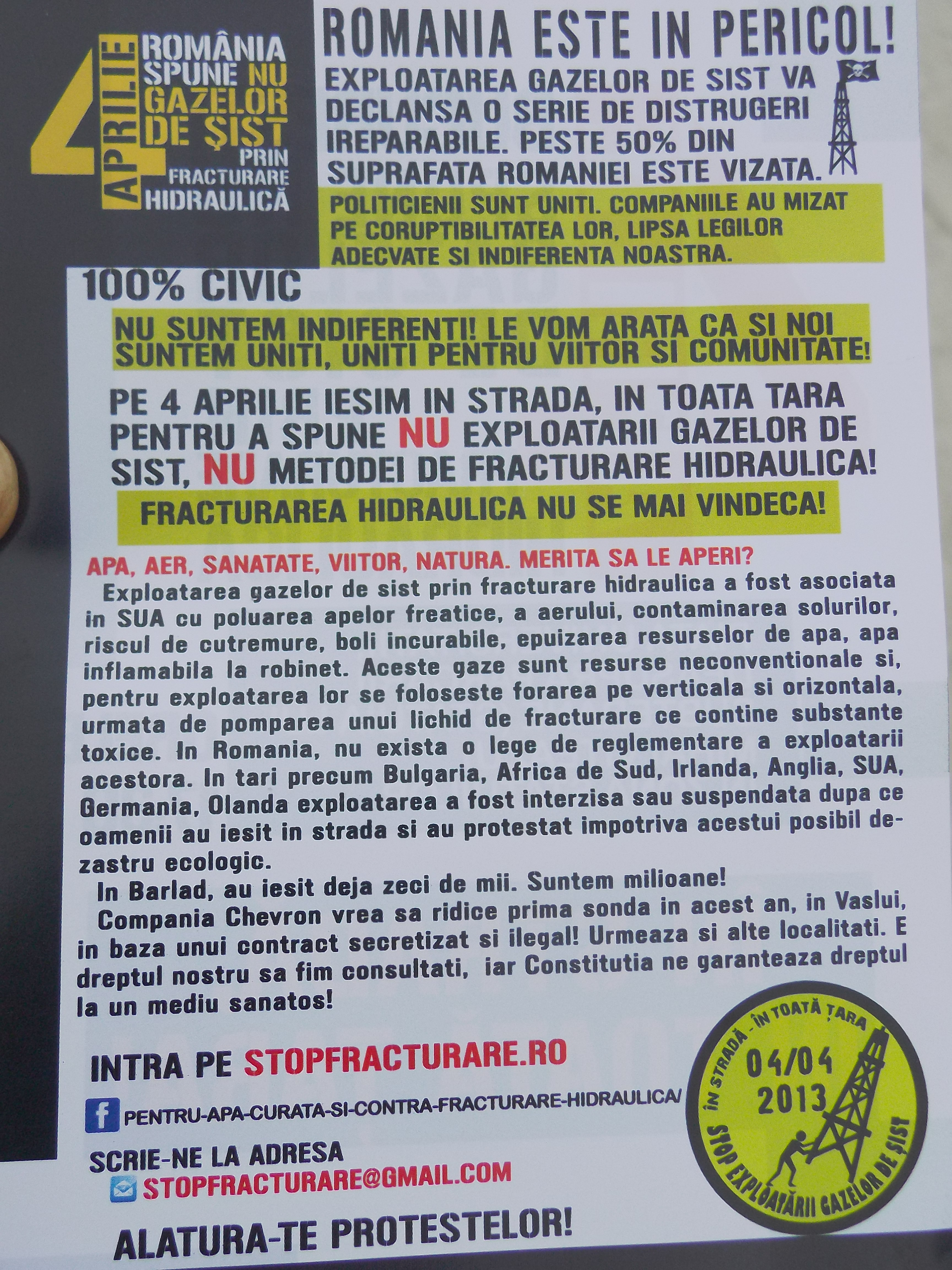 JURNALUL: „În Bârlad, epicentrul protestelor de până acum, circa 1.000 de oameni s-au strâns lângă biserica Sfântul Ilie, în vreme ce în altă parte a oraşului un protest spontan a început în faţa Primăriei, din cauza faptului că aceasta nu a acordat autorizaţie pentru un miting. Oamenii au înfruntat ploaia şi au afişat bannere cu “Chevron Go Home”. Ulterior, manifestanţii s-au îndreptat spre casa primarului Constantin Constantinescu.” DETALII