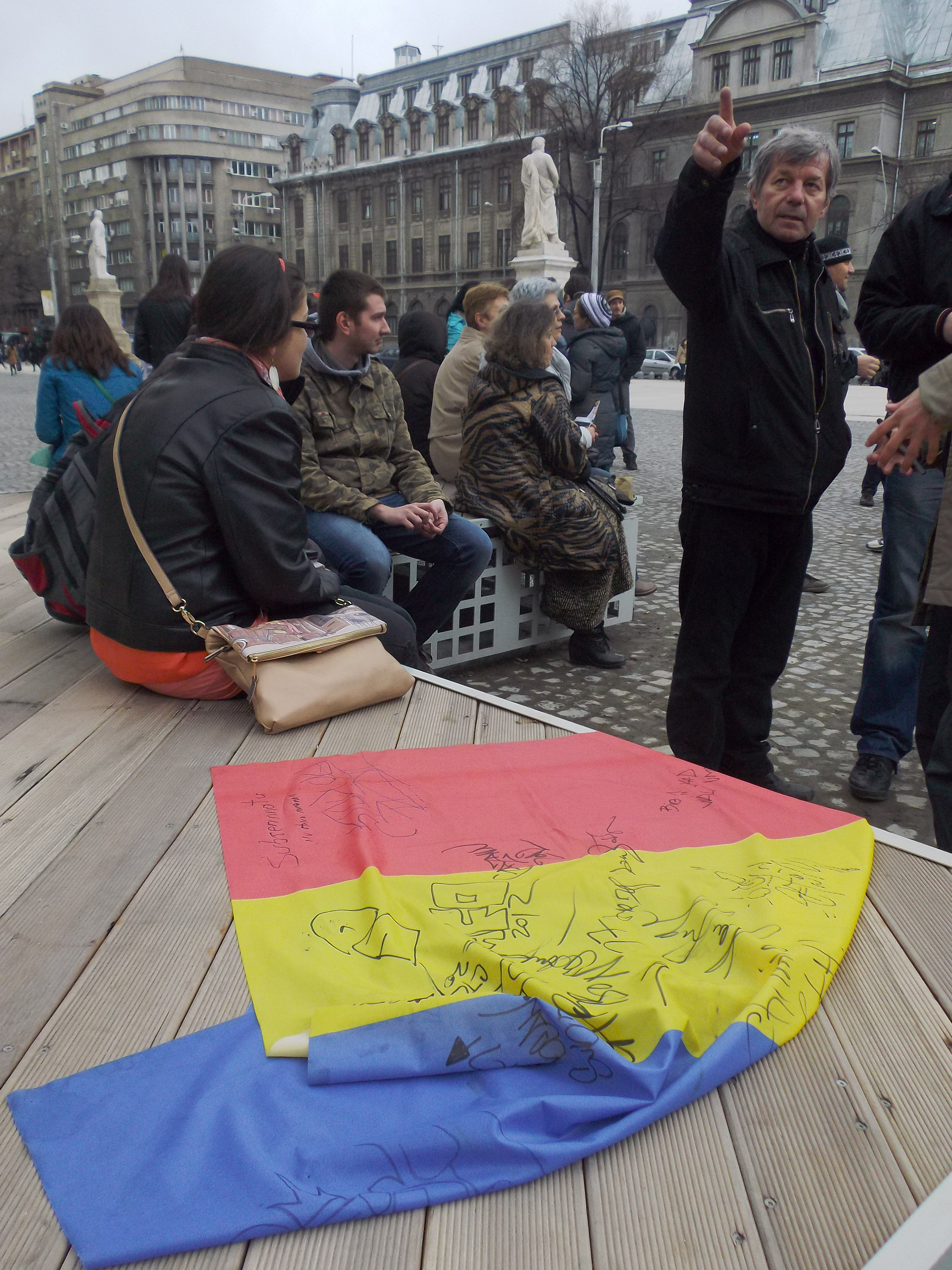 INSIDER: „Ca orice student care se respectă şi învaţă în 3 zile şi limba chineză pentru un examen în sesiune, aşa şi autorităţile locale s-au apucat de muncă pe ultima sută de metri. Începând de săptămâna trecută şi până aseară târziu în noapte, zeci de lucratori au turnat asfalt, au lipit placuţe de marmură, au înjghebat un podium, au curăţat gunoaiele, tuns şi periat iarba, au vopsit, spălat şi şamponat doar trotuarul din jurul monumentului. Astăzi la inaugurare – covor roşu împrumutat de la vreun minister din apropiere, brăduţi în ghivece închiriaţi cu ziua pentru decor, poliţie calare pe fundal, câţiva trecători gură-cască şi presă plictisită cât cuprinde. Din spatele monumentului, un DJ se străduia să creeze o atmosferă pariziană cu: Joe Dassin – „Les Champs-Elysées”, Edith Piaf – „Non, Je ne regrette rien”, Vanessa Paradis – „Joe le taxi”. …Dacă v-au plăcut bufonii, mai poftiţi şi-n altă seară!”