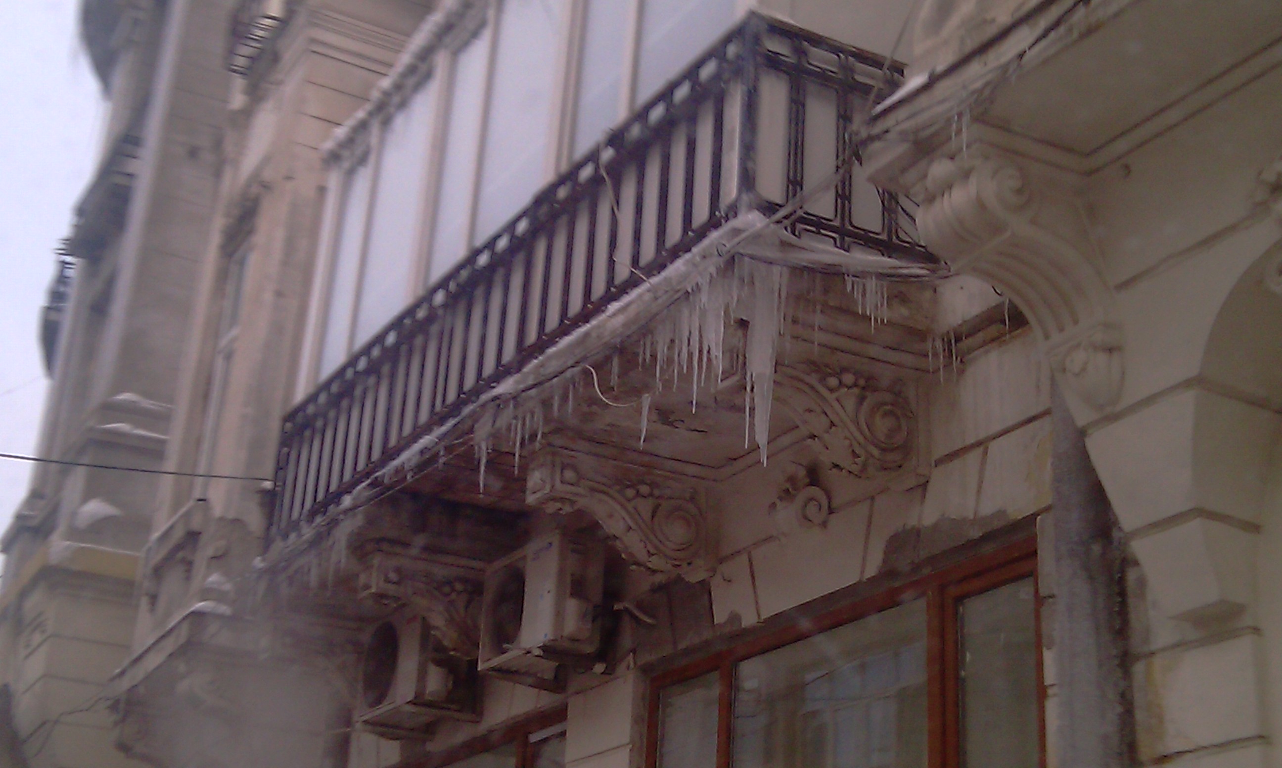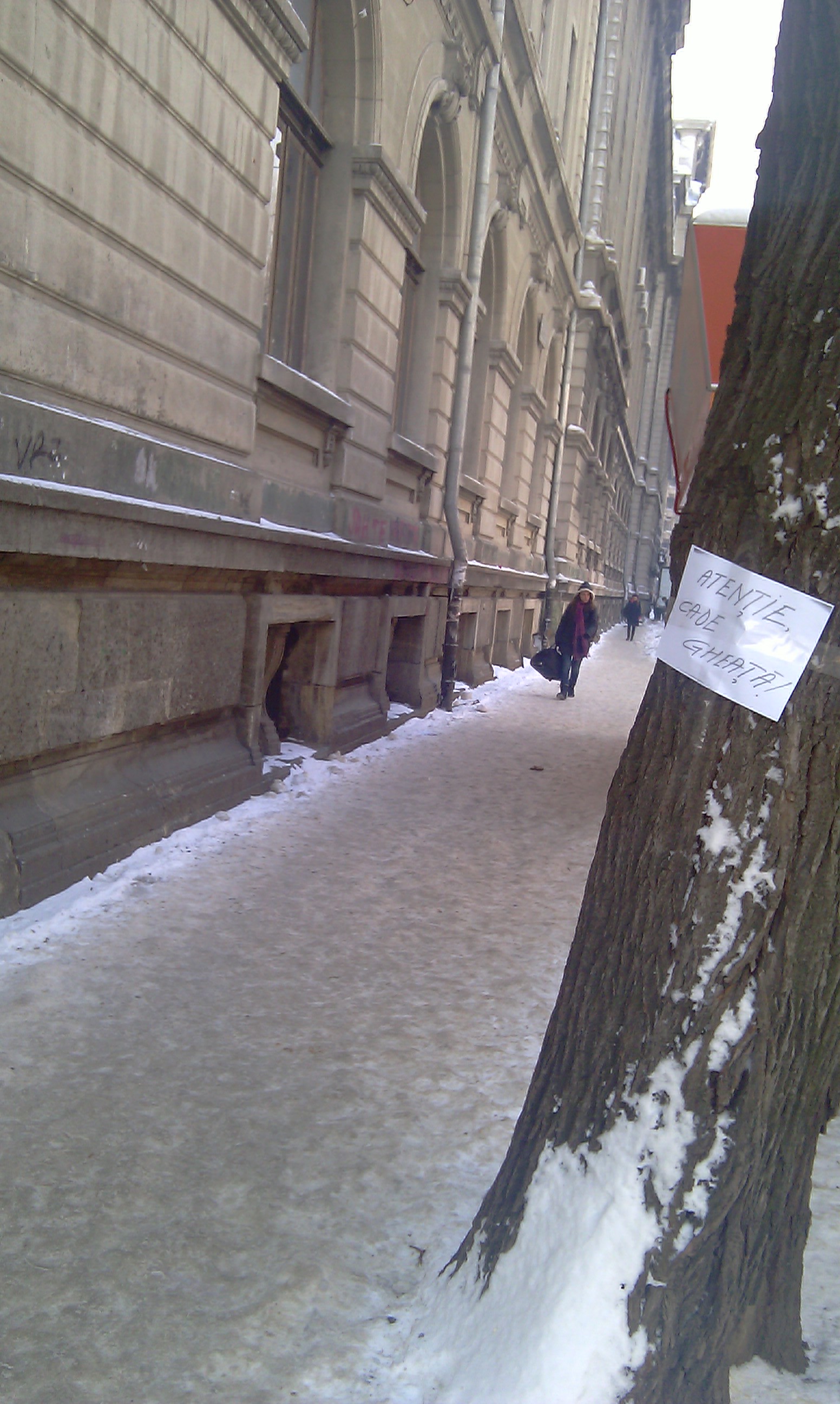INDIFERENŢĂ: „Atenţie, cad ţurţuri. Nu trebuie curăţaţi, cad singuri. Mergi pe stradă pe riscul tău!”