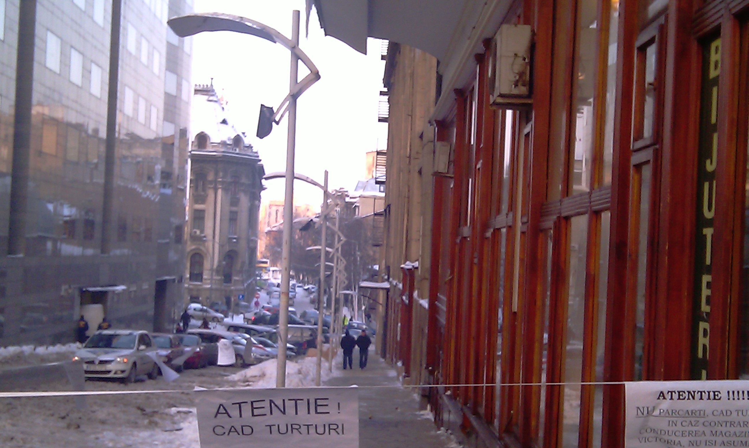 INSIDER: „Proprietarii sau responsabilii clădirilor au găsit cea mai uşoară cale de liniştire a conştiinţei şi dacă se întâmplă ceva – „mergi pe stradă pe riscul tău”. Adică „mortul e de vină” pentru că era pus un afiş cu „Pericol, cad ţurturi” (!?) Poate ar fi mai uşor să angajeze nişte trăgători cu praştia să salveze astfel omenirea de drobul de sare… Aceste afişe vor rămâne de actualitate până la primăvară, aşteptând ca soarele să rezolve problema.”