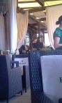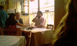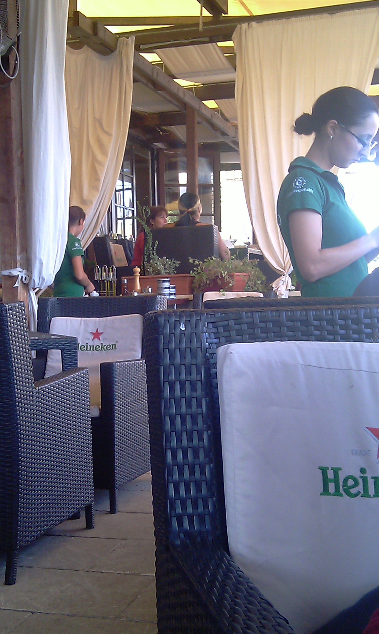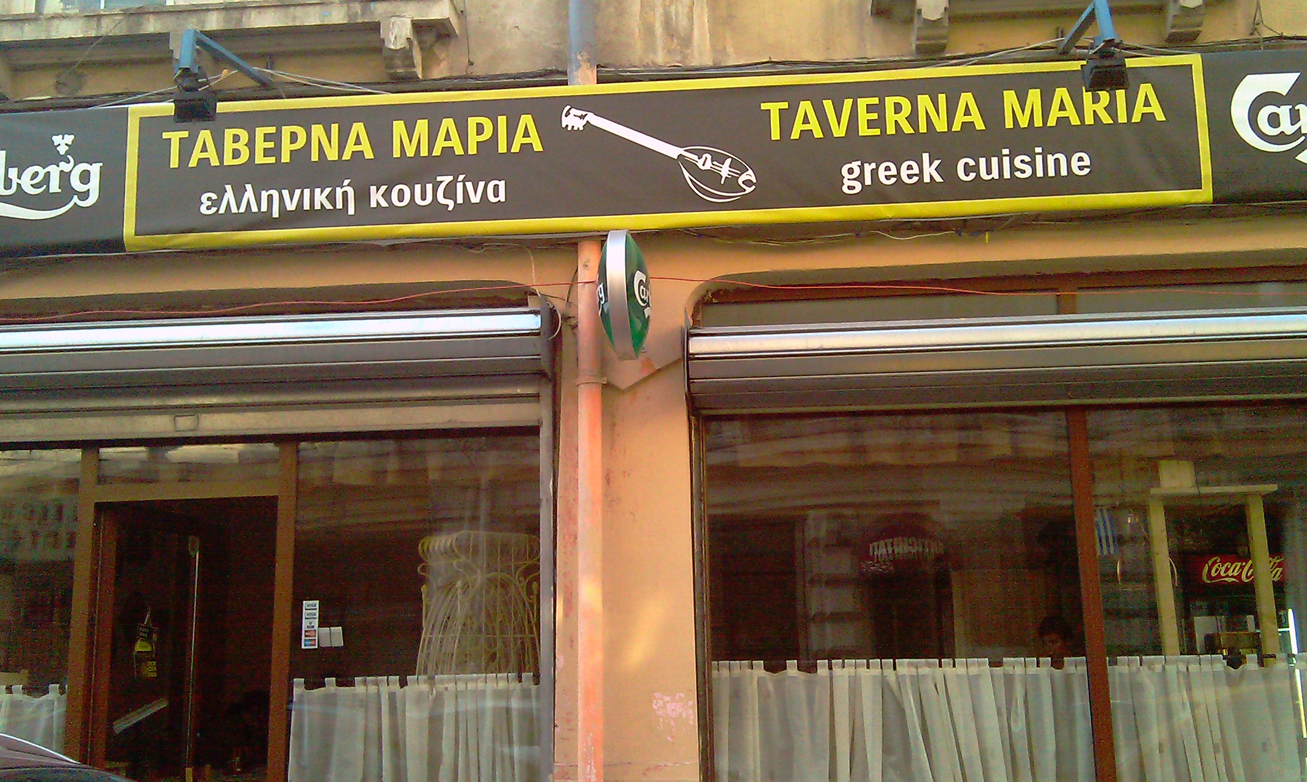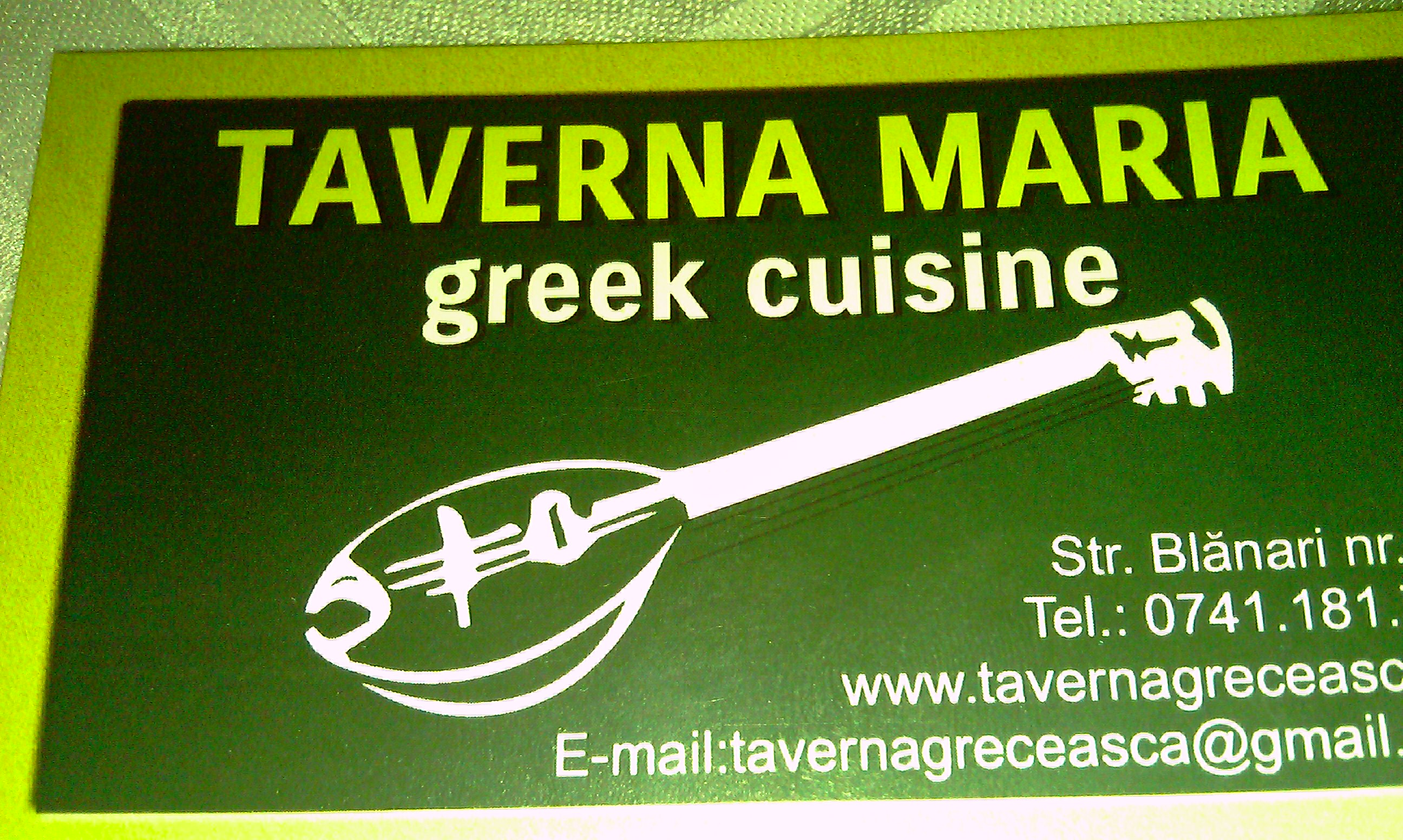 …În rest, tzatziki, gyros, souflaki, kleftiko şi muzică grecească …de la laptop. Până seara când vin muzicanţii, bouzouki este folosită doar ca decor. Ca experienţă culinară, am comandat o salată Maria de 17 lei, dar am fluierat a pagubă… Un castronel mic cu nişte frunze de salată şi bucati de ardei copt şi aromat (bun!) şi nişte brânză… Noroc cu măslinele din partea casei şi salata tzatziki comandată suplimentar!”
