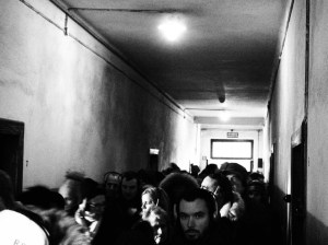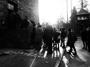 La intrarea era o coadă de un kilometru (mai să îmi vină să zic ce noroc că am făcut rezervare cu destul timp înainte pentru un tur individual, fără ghidaj, fără nimic altceva, ba chiar gratuit, că altfel sigur nu mă înghesuiam eu la coada aia de peste o mie de oameni), apoi după coada la bilete mai era o alta coadă pentru acces în grup, și după ce am fost deposedată de rucsac, că cică era prea mare și nu ai voie sa intri decât cu o poșetuta (firește, deposedarea de rucsac se face contra cost, adică plătești 4 zloți ca să îl lași într-o gheretă), și am trecut și de controlul de securitate, am intrat. Și turiștii colcăiau peste tot, organizați în grupuri,