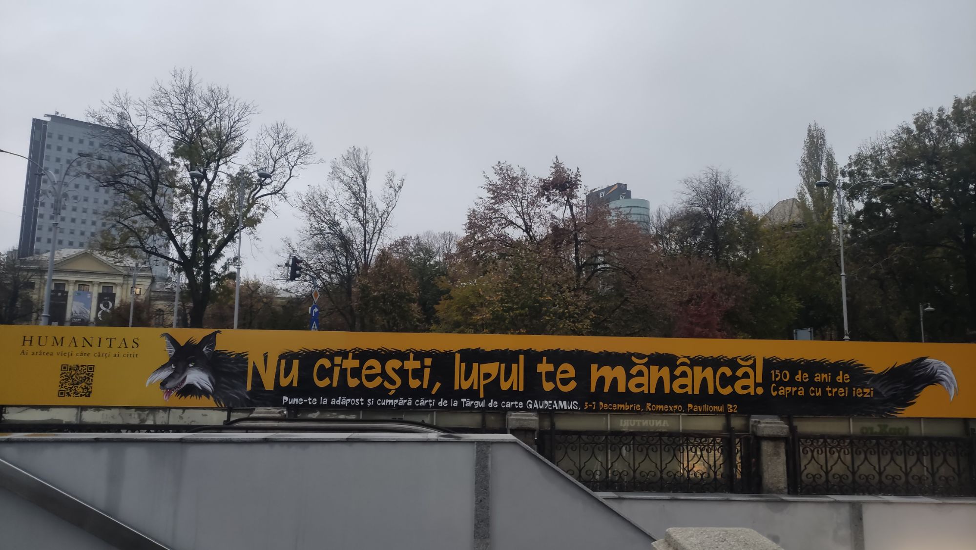 CAPRA CU TREI IEZI – 150 ANI: „Nu citești, lupul te mănâncă!” – reclamă stradală la Târgul de Carte Gaudeamus