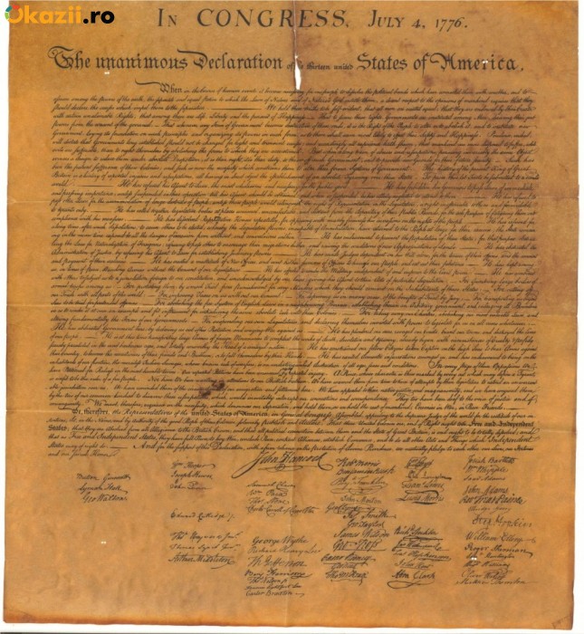 VÂNZĂTOR: „Oferta se adreseaza colectionarilor de documente vechi din toata lumea care vor sa valorifice Declaratia de Independenta SUA 1776. Documentul este autentic si are peste 200 de ani vechime acesta fiind semnat de cei 56 de delegati ai Congresului Continental din partea celor 13 colonii.