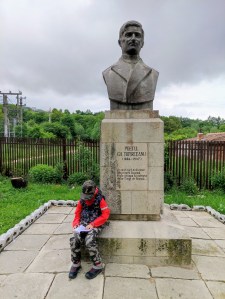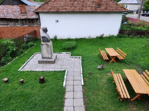 Afară, printre copaci, veghează statuia de bronz a poetului, ridicată în 1973 de ofiţerul în rezervă Marius Buturoiu, pe soclul căreia sunt gravate ultimele versuri din „Balada morţii” – poetul, însă, n-a murit şi nici nu s a născut aici. „lar când norii-nvăluiesc/ Alba nopții Doamnă/ Peste groapa lui pornesc / Vânturi lungi de toamna…”